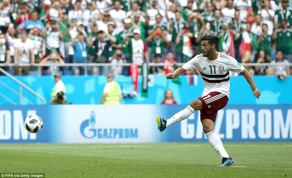Trước đó, tiền đạo Carlos Vela đã giúp đội tuyển Mexico vươn lên dẫn trước khi thực hiện thành công quả 11m.