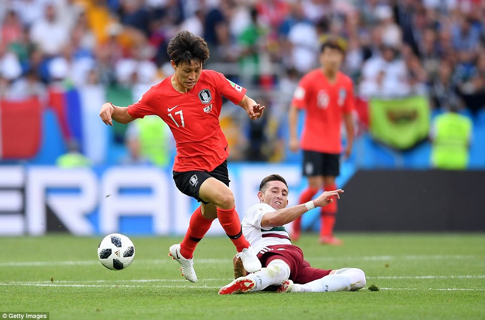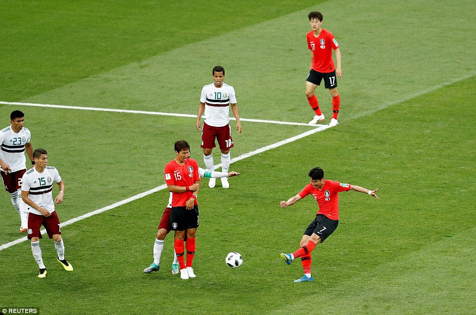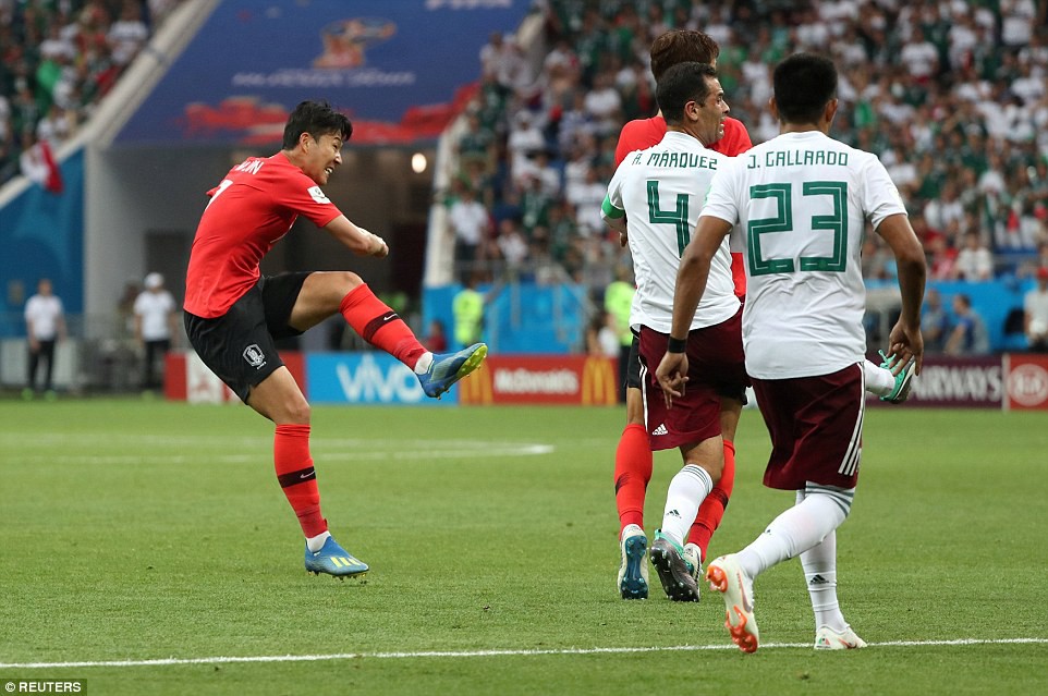 Phút 90+3, Son Heung-min có pha đi bóng khéo léo rồi tung cú dứt điểm quyết đoán đánh bại thủ thành Ochoa, rút ngắn cách biệt xuống còn 1-2 cho đội tuyển Hàn Quốc.